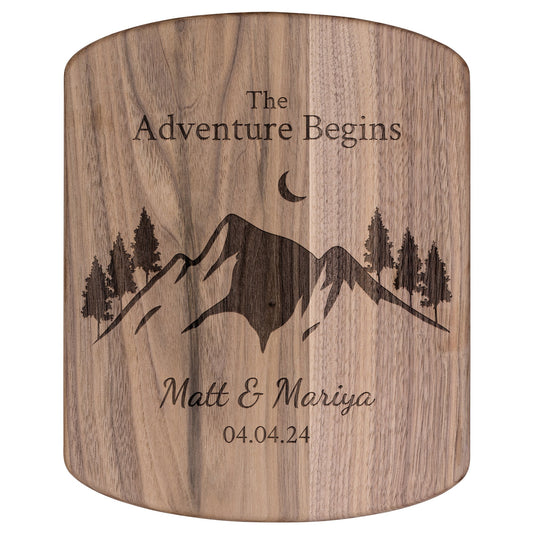 The Adventure Begins Hardwood Oval Cutting Board Personalized with Names and Wedding Date