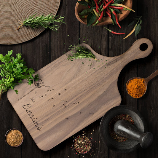 Whimsical Dandelion Cutting Board Personalize Family Name, Great Cabincore gift for that whimsical couple, wedding gift