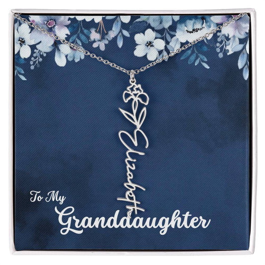 To My Granddaughter Necklace, Personalize with Name and Birth Flower Month | Navy with Soft Blue Flowers