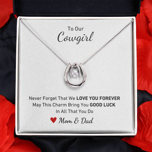 To Our Cowgirl, Know We Love You Forever, Good Luck Necklace from Mom & Dad to Daughter That Loves Horses